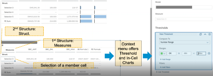 Cuando trabajemos con querys de BW, ahora podremos definir gráficos y umbrales en la celda para la segunda estructura. Podremos definir ambas dimensiones como una dimensión de definición de número. Facilita la configuración de gráficos y umbrales en la celda para tablas de querys BW en SAC.