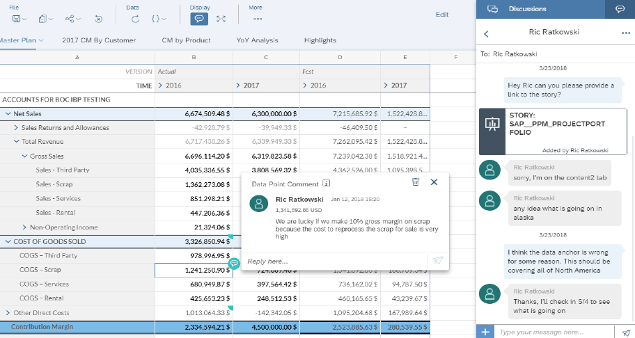 La comunicación, entre los distintos usuarios de un proceso de planificación, es de lo mas normal, con BPC Standar podemos activar «Comentarios», es sencillo «Activarla», en BPC Embedded ya es un poco mas complicado y tenemos que crearnos un ADSO para poder guardar estos comentarios, con SAC esta parte es mucho mas potente, desde abrir hilos de conversación, adjuntarles historias o documentos, y en la parte de comentarios podemos incluir comentarios a nivel de tabla hasta cada una de las celdas. Con todo el seguimiento de quien, cuando y donde se hizo, es decir, el valor donde se incluye el comentario.