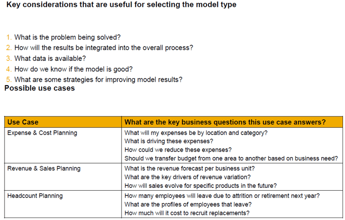 Continúan con la descripción de las capacidades que tenemos con el análisis predictivo y como tenemos que comenzar, es decir, que preguntas tendríamos que hacernos cuando comenzamos un proyecto de predicción. También nos dejan los posibles casos de usos, como Planificación de gastos / costes, ingresos / ventas, planificación en HR..