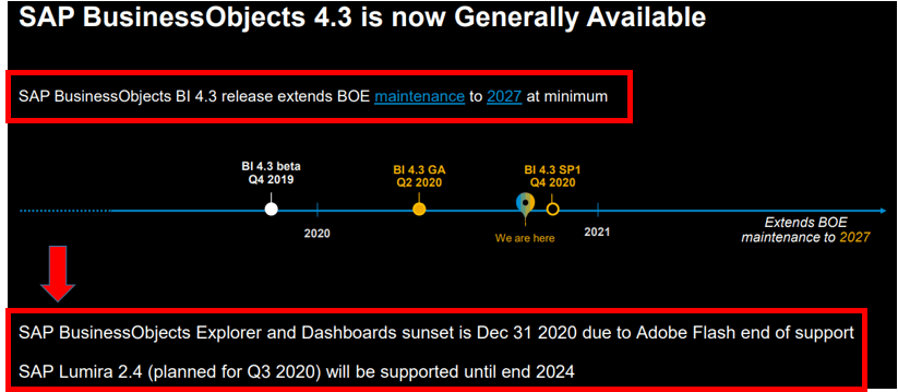 El 31 de Diciembre 2020, Adobe Flash deja de ser operativo y SAP ya no dará soporte, por lo que, SAP BusinessObjects Explorer y SAP BusinessObjects Xcelsius (Dashboards) dejarán de ser parte de SAP BO y la solución que nos ofrecen es SAP Analytics Cloud Data Discovery y Analytics Designer son sus soluciones.
