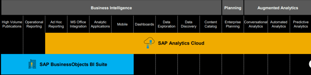 Seguimos con la comparación entre SAC y BO, podremos comprobar que SAC terminará por abarcar todo lo que contiene SAP BO y mucho mas, como Planning, toda la parte Augmented Analytics, colaboración etc.