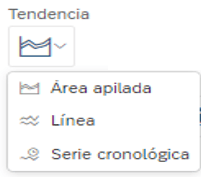 - El gráfico de líneas y también los Cronología de tiempo, muestran las medidas durante un período de tiempo, adecuados para mostrar tendencias. El eje Y siempre muestra un valor de medida y el eje X una dimensión de tiempo.