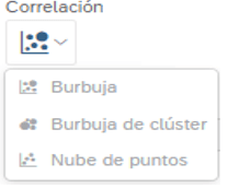 - Burbuja de clúster, Este estilo de gráfico de burbujas es otra forma de mostrar el valor de una medida basada en dos dimensiones. La mejor manera de explorar un gráfico de burbujas de clúster en SAP Analytics Cloud es colocando el cursor sobre cada burbuja para mostrar la información sobre herramientas que contiene información más detallada.