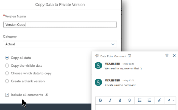 Vamos a poder conservar los comentarios de los puntos de datos al copiar versiones. Al publicar versiones privadas, los comentarios se copian a la versión pública mientras se eliminan los duplicados.