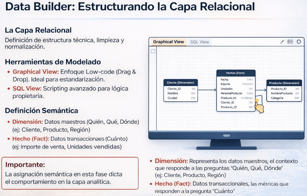 • Modelado Híbrido: La capacidad de construir una base relacional técnica robusta y, sobre ella, exponer un modelo analítico comprensible para el negocio.