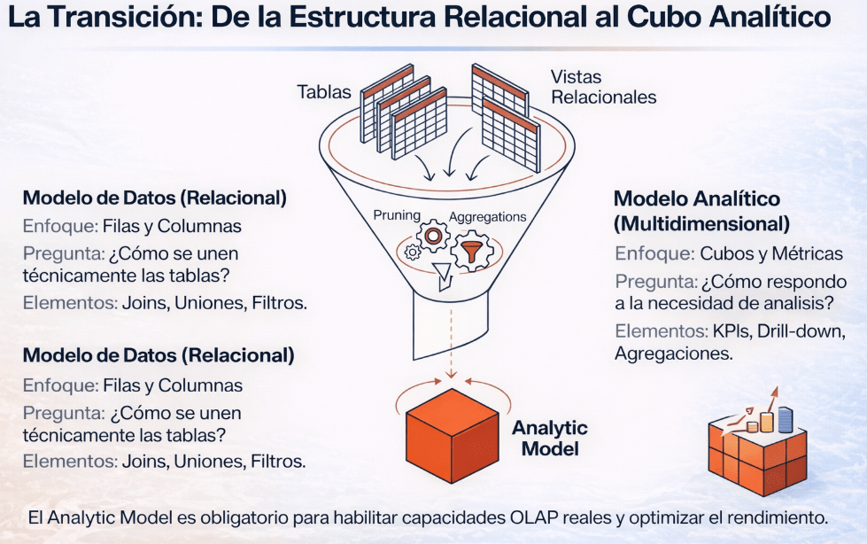 Una vez que tenemos la base relacional construida, damos el salto a la capa analítica. Este paso lo podemos visualizar como un embudo: tomamos las múltiples tablas y vistas técnicas de las capas de datos y, mediante procesos de optimización como el Pruning y las Aggregations, las transformamos en un único cubo analítico, enfocado y optimizado para el negocio.