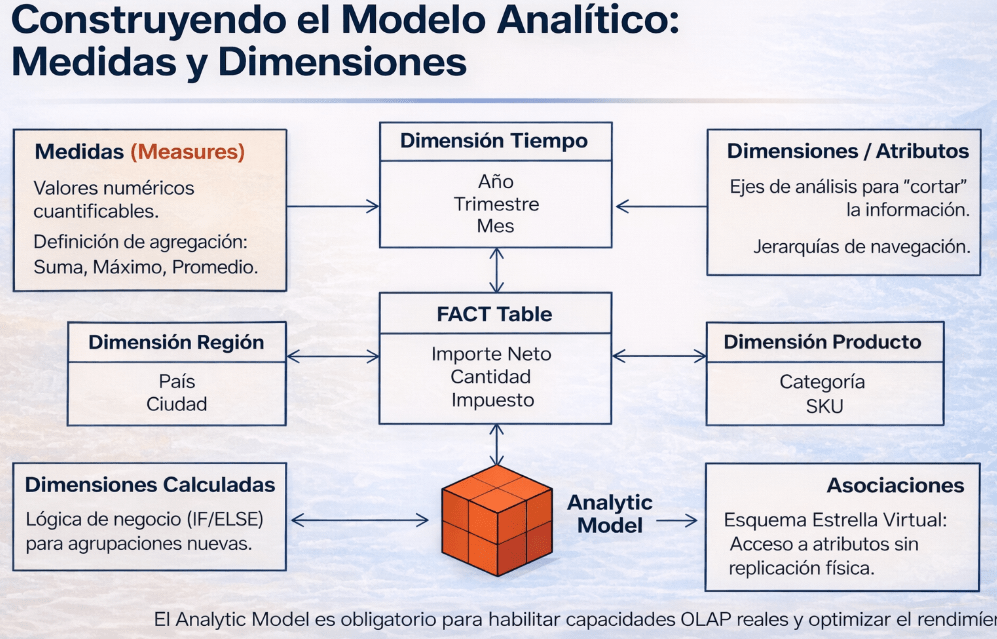 El Analytic Model es el objeto final de esta fase y es obligatorio para el consumo en herramientas de reporting como SAP Analytics Cloud. Es este modelo el que habilita las capacidades OLAP (navegación, jerarquías, etc.) y garantiza un rendimiento óptimo en las consultas. Es aquí donde el contexto semántico preservado se vuelve realmente potente, exponiendo los datos de una forma que el negocio entiende de forma nativa. Sus componentes clave son las Medidas (Measures), que son los valores cuantificables (Importe Neto, Cantidad), y las Dimensiones, que son los ejes por los que analizamos esas medidas (Tiempo, Región, Producto).