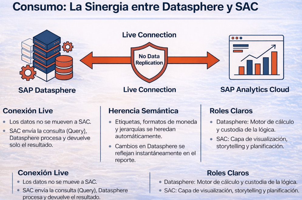 Esto significa que los datos nunca se mueven ni se replican en SAC. Cuando un usuario abre un informe en SAC, la herramienta envía una consulta a SAP Datasphere. Este, que es el motor de cálculo, procesa la petición y devuelve únicamente el resultado agregado. Esto no solo es eficiente, sino que garantiza que los cambios en SAP Datasphere se reflejan instantáneamente en el reporte.