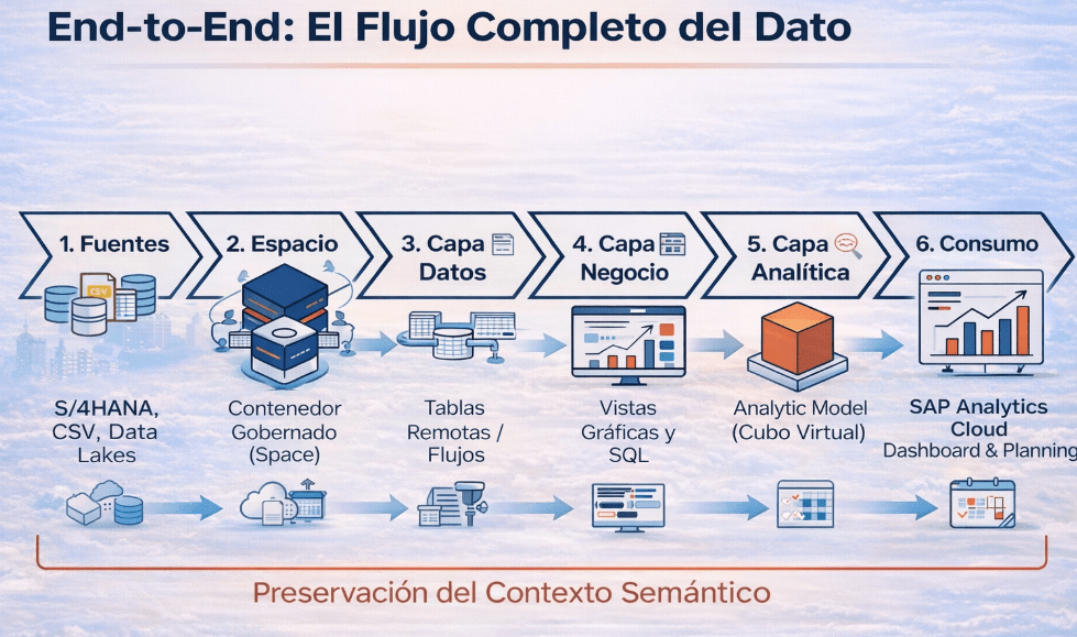 • SAP Datasphere: Es el motor de cálculo y el custodio de la lógica de negocio.