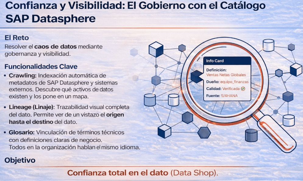 Para cerrar el ciclo y no menos importante, asegurando que todo este flujo no se convierta en otro silo de datos, SAP Datasphere incluye el Catálogo. Esta herramienta está diseñada para resolver el caos de datos mediante gobernanza y visibilidad.