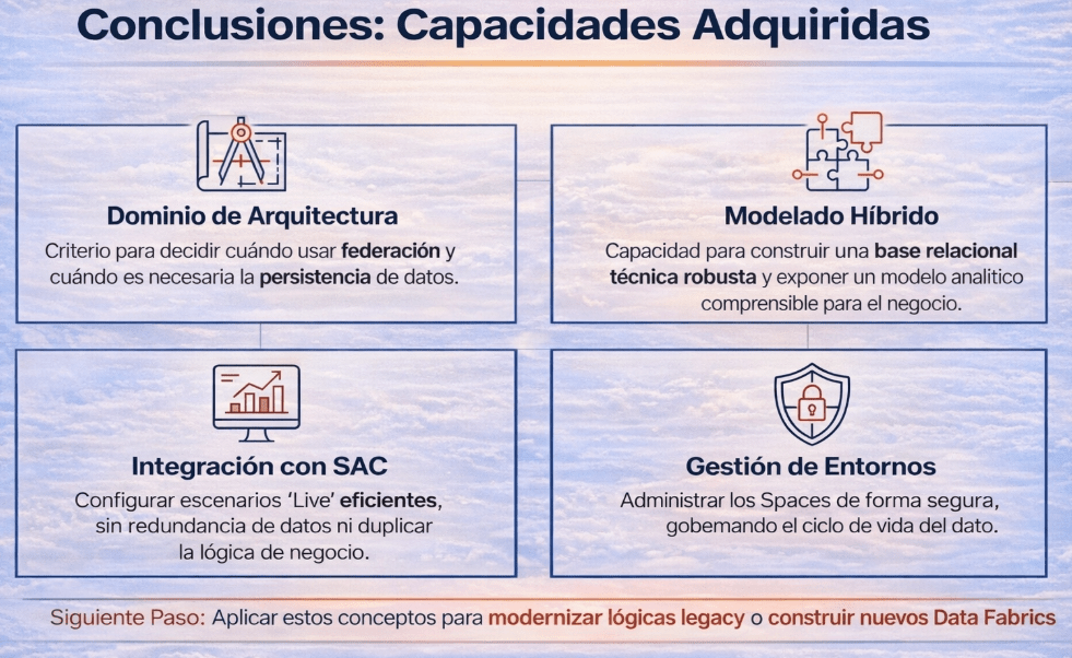 Con este curso vamos a poder entender este recorrido de principio a fin no es un ejercicio teórico. Es nuestra base para desarrollar las capacidades que realmente importan a la hora de trabajar con SAP Datasphere. No se trata de memorizar botones, sino de adquirir criterio.