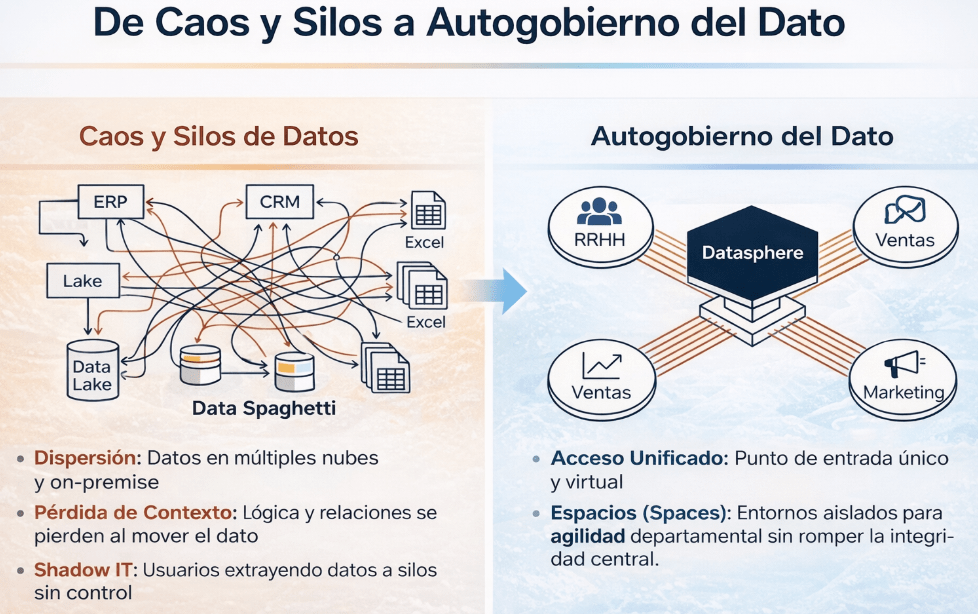 Durante años, como hemos ido viendo con la experiencia, los datos en las empresas han sido un «pequeño caos» que muchos llaman «Data Spaghetti»: datos dispersos en sistemas on-premise, Excel y no puede faltar «nubes», con integraciones frágiles que pierden el contexto de negocio por el camino. SAP Datasphere nos lo presentan como la evolución hacia un Business Data Fabric, una arquitectura que busca poner orden en este «pequeño caos».