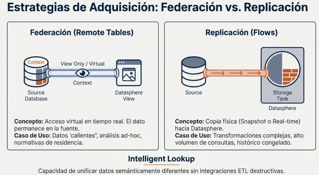 Todo proyecto de datos comienza conectando las fuentes. SAP Datasphere está diseñado para integrarse tanto con el ecosistema SAP (S/4HANA, BW/4HANA…) como con sistemas externos (Hyperscalers como AWS o Google, Data Lakes, etc.). Para esto, nos ofrece dos estrategias principales de adquisición, y elegir la correcta es una de las primeras decisiones de arquitectura clave.
