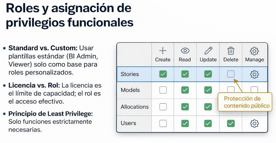 Es crucial entender también la distinción entre licencia y rol. La licencia (ej. Business Intelligence) define el límite máximo de capacidad que tiene un usuario, mientras que el rol define el acceso efectivo que se le concede dentro de ese límite. Un usuario puede tener una licencia de BI, pero si su rol solo le permite leer historias, no podrá crear contenido nuevo.