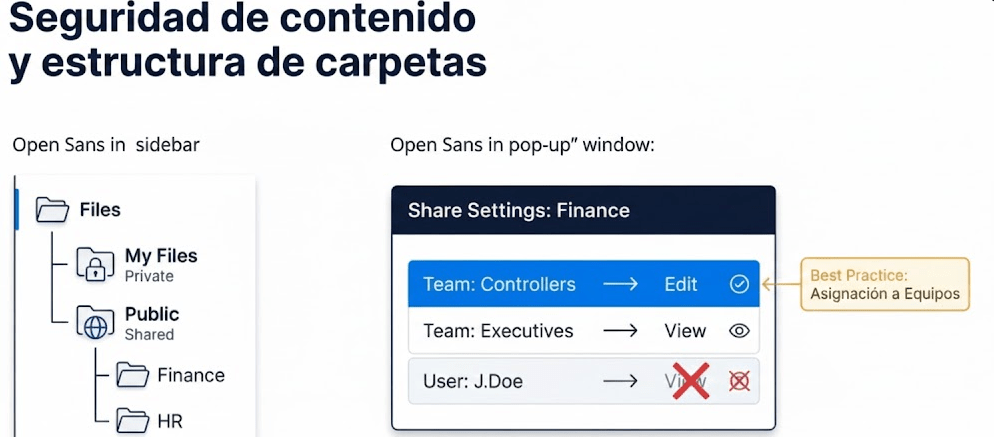La seguridad se aplica directamente sobre estas carpetas. Sin embargo, la práctica más recomendable y escalable es asignar permisos a Equipos en lugar de a usuarios individuales. Un equipo es simplemente un grupo de usuarios (ej. «Controllers», «Executives»). Intentar gestionar el acceso persona por persona es un camino directo hacia el caos administrativo. Es como intentar dar llaves individuales del edificio a cada empleado en lugar de darle una llave maestra al departamento de seguridad. Al compartir una carpeta con el equipo «Controllers», cualquier usuario que pertenezca a ese equipo heredará automáticamente los permisos. Si un nuevo controlador se une a la empresa, basta con añadirlo al equipo para que obtenga acceso a todo el contenido relevante, sin necesidad de modificar los permisos de cada carpeta individualmente. Este enfoque simplifica enormemente el mantenimiento y reduce el riesgo de errores.