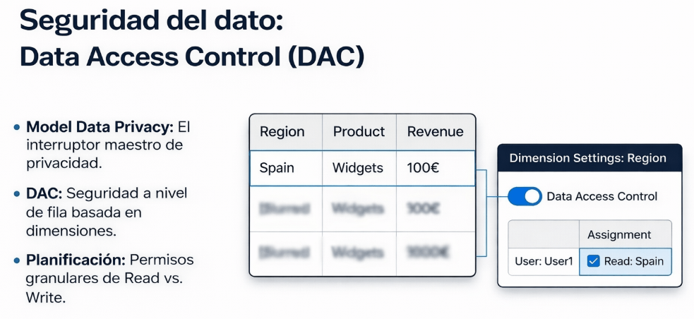 Este control se implementa a través del Data Access Control (DAC). El DAC funciona como una seguridad a nivel de fila que se configura directamente en el modelo de datos. Se basa en las dimensiones del modelo para filtrar la información. Por ejemplo, podemos crear una regla que vincule a cada usuario con los valores de la dimensión «Región» que tiene permitido ver.
