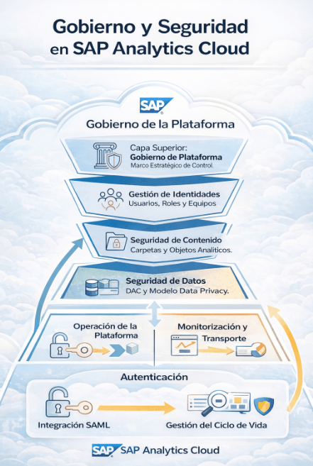 Llegados a este punto, es evidente que la autenticación, la gestión de usuarios y roles, la seguridad de contenido y datos, la monitorización y el transporte de contenido no son silos independientes. Son componentes interconectados de un único y coherente ecosistema de gobierno. Un cambio en la configuración del IdP (autenticación) puede afectar la asignación automática de roles, lo que a su vez determina el acceso a las carpetas y, en última instancia, los datos que un usuario ve en un informe transportado a producción y cuyo rendimiento estamos monitorizando.