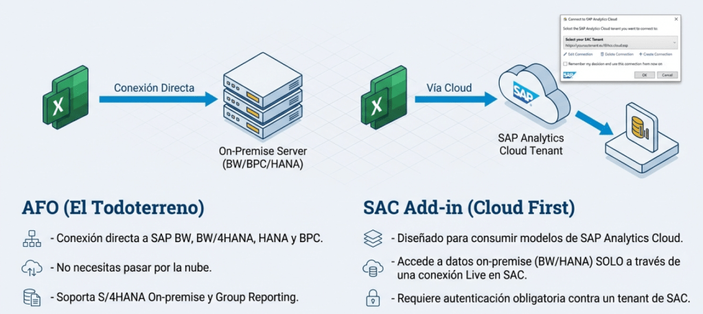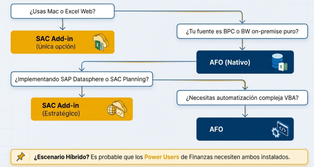 En muchos proyectos, la solución es híbrida: AFO para el reporting histórico pesado y SAC Add-in para planificación y simulación.