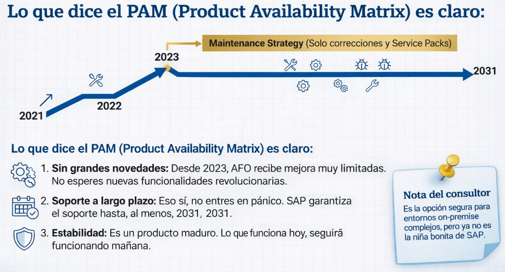 Según el PAM, AFO 2.8 tiene soporte hasta 2031, pero desde 2023 está en modo mantenimiento. Esto significa estabilidad y correcciones, pero pocas novedades funcionales.